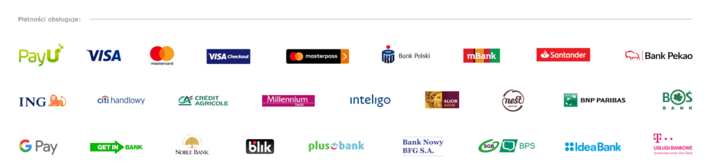 Skorzystaj z szybkich płatności online PayU. Oferujemy szeroki wachlarz bezpiecznych płatności online takich jak: przelew, Google Pay, BLIK, płatność z karty debetowej lub kredytowej: Visa Debit, Visa Electron, Visa Credit Card, Master Card, Maestro.